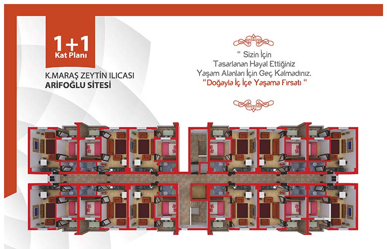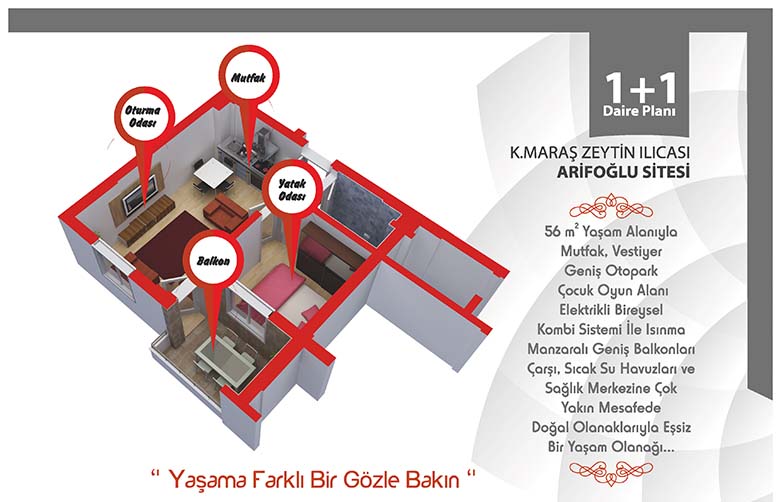 56 m2 Yaşam Alanı 1+1 Stüdyo tipi daireler Kombi sistemi ile ısınma Geniş ve manzaralı balkonlar